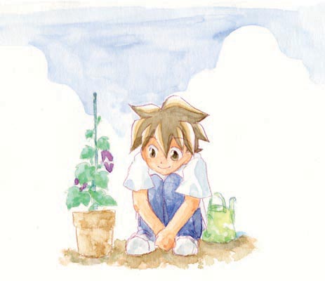 朝顔の観察中ワタルさん。